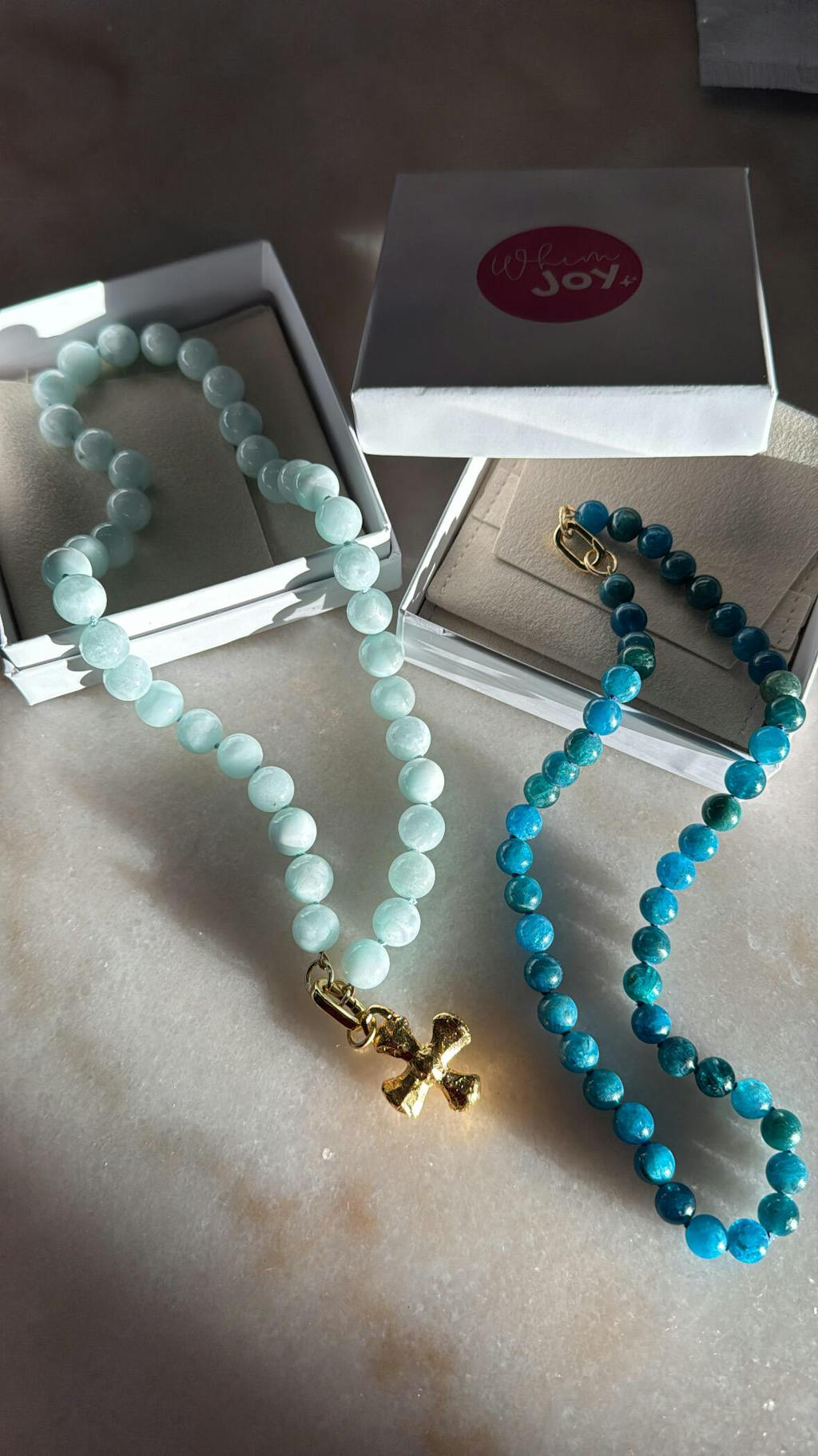 • Includes: 18" Moonstone Bubblegum Gem Necklace + 16" Apatite Bubblegum Gem Necklace, Large Cross Charm